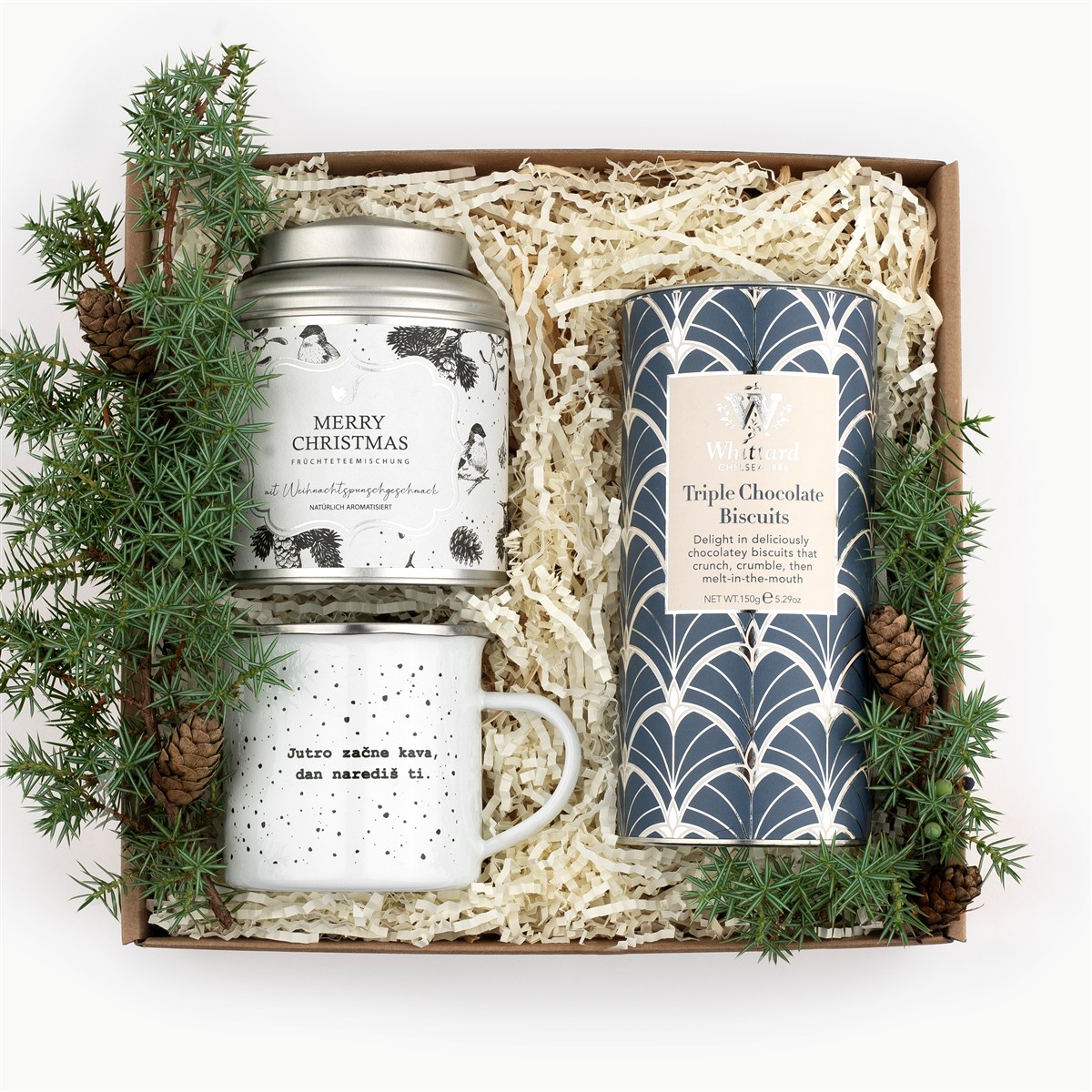 Paket Čarobna jutra poskrbi za popoln začetek dneva v prazničnem vzdušju. Vsebuje sadni čaj v pločevinki z motivom »Merry Christmas«, emajlirano skodelico z napisom »Jutro začne kava, dan narediš ti« ter piškote s tremi vrstami čokolade. Darilo, ki združi toplino, okus in čarobnost prazničnih dni.