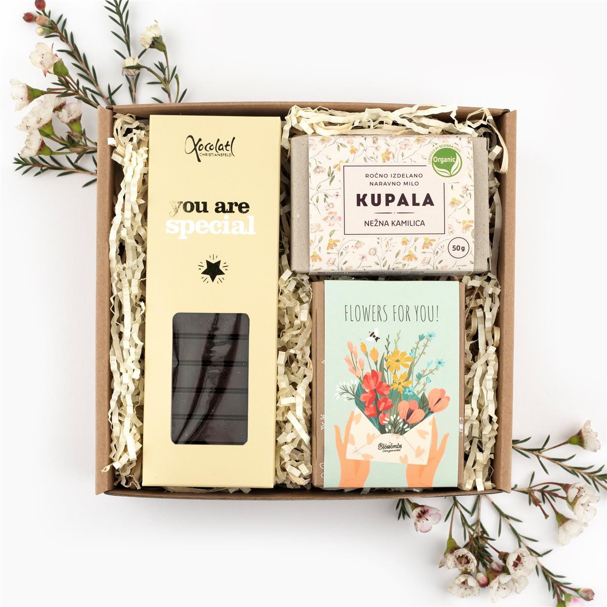 Paket Cvetlična nežnost združuje slastno temno čokolado, naravno milo z vonjem kamilice in cvetlične bombice za divje cvetje. Popolno darilo za sproščanje, skrb zase in priložnost, da narava zacveti tudi doma.