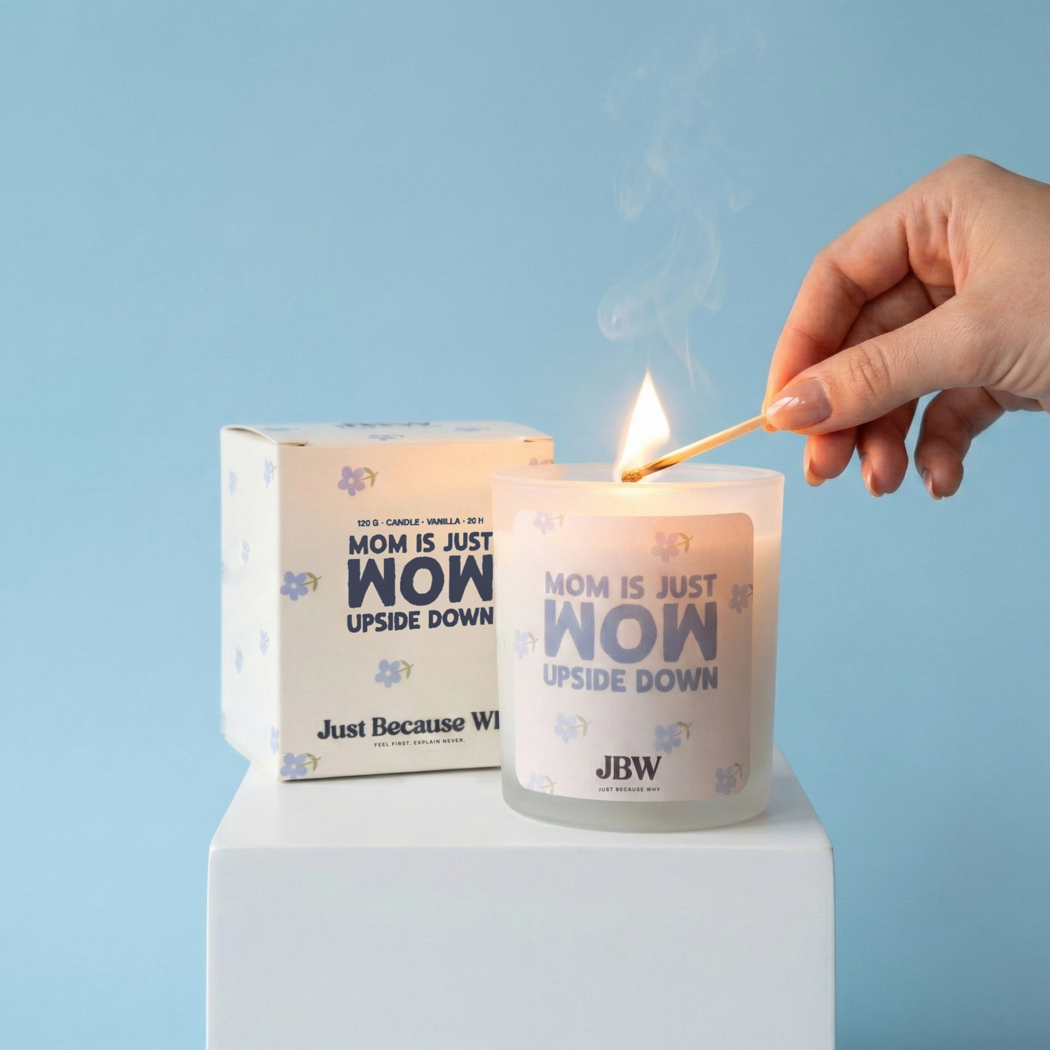 Sveča je izdelana iz rastlinskega voska in vlita v minimalističen matiran steklen kozarec, ki se poda v vsak dom. Ko zagori, ustvari prijetno in sproščeno vzdušje. Sveča je zapakirana v elegantno embalažo z napisom “Mom is just wow upside down". Popolna izbira za materinski dan, rojstni dan ali kot majhna pozornost, ko želiš mami sporočiti nekaj lepega.