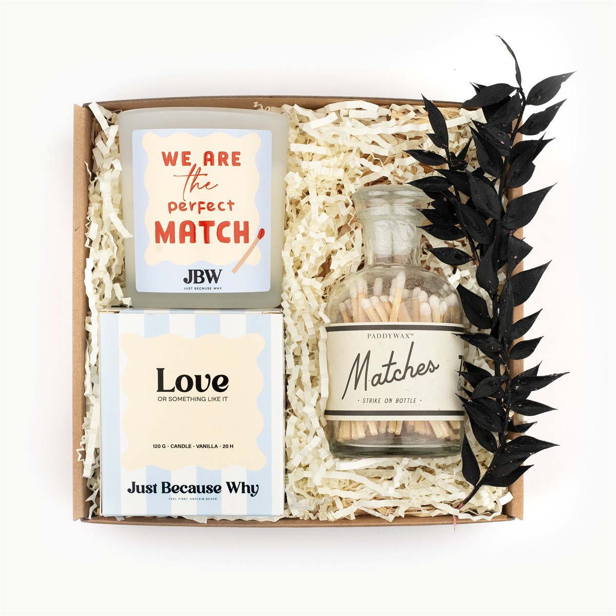 Paket Perfect Match združuje dišečo svečo z romantičnim sporočilom in elegantno stekleničko z vžigalicami za ustvarjanje toplih, intimnih trenutkov. Popolna mala pozornost za vse, ki verjamejo, da prava kombinacija vedno zaneti iskrico.