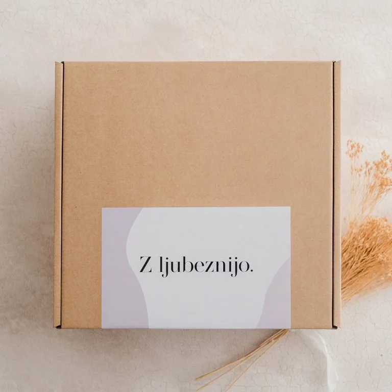 Nalepko na škatlo nalepimo tako, da paket lahko še odprete in preverite vsebino ter po potrebi dodate še kaj svojega.