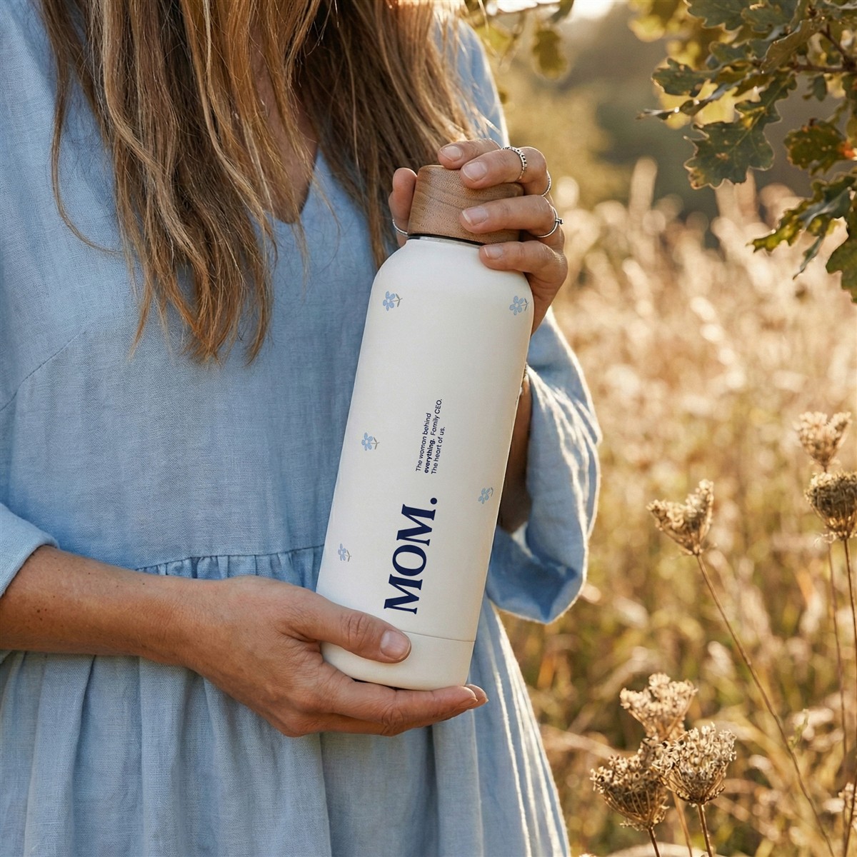 Prikupna bela steklenička z minimalističnimi, nežno modrimi rožicami in napisom "MOM. The woman behind everything. Family CEO. The heart of us." Popolno darilo za materinski dan, za novopečeno mamico ali kar tako, da polepšate dan svoji mami in ji poveste, kako izjemna je.