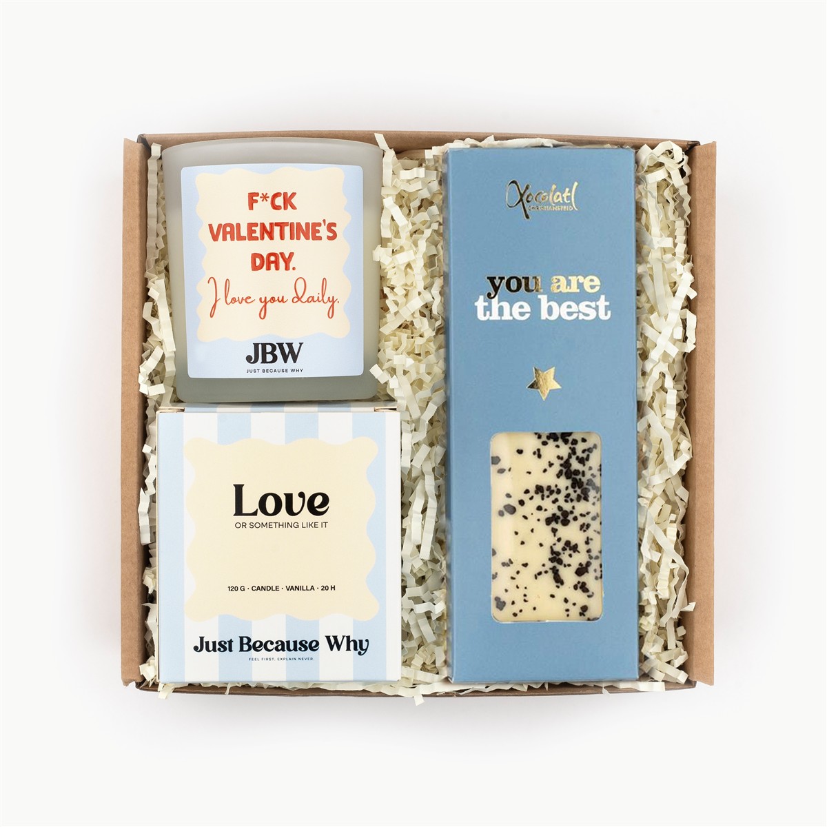 - dišečo svečo iz rastlinskega voska v matiranem steklenem kozarcu z napisom "F* Valentine's day. I love you daily.", 120 g, JustBecauseWhy, Slovenija,