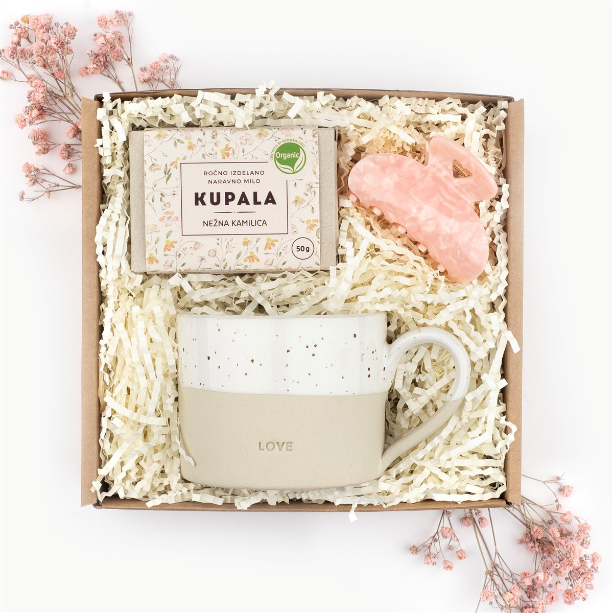 Paket Trenutek zate združuje nežno naravno milo, čudovito glineno skodelico z napisom Love ter prikupno sponko za lase s srčkom. Lepo darilo za valentinovo ali kot srčna pozornost za nekoga, ki nam veliko pomeni – partnerko, prijateljico ali drago mami.