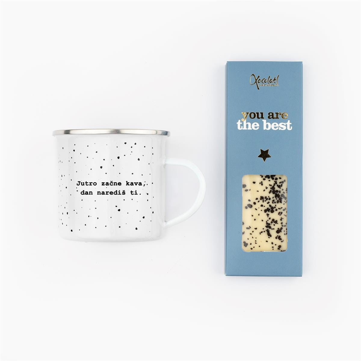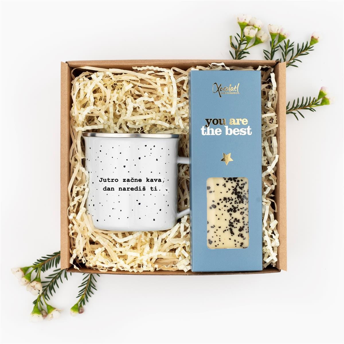 Pokažite svojo naklonjenost z našim edinstvenim darilnim paketom You are the best, ki je popolna kombinacija ljubezni in sladke pozornosti. Vsebuje čudovito skodelico z napisom "Jutro začne kava, dan narediš ti." in okusno čokolado, ki nosi napis "you are the best". Idealno darilo za valentinovo, rojstni dan ali kar tako, da izrazite hvaležnost posebni osebi v vašem življenju.