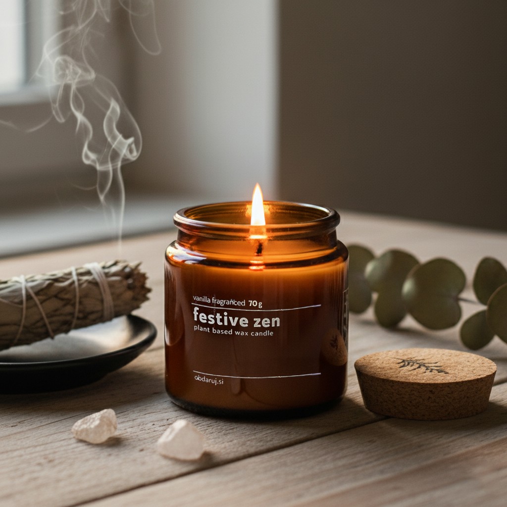 - dišečo svečo Festive zen, 70 g, čas gorenja: do 12 ur, dimenzije: 6,2 × 6,2 cm, obdaruj.si,